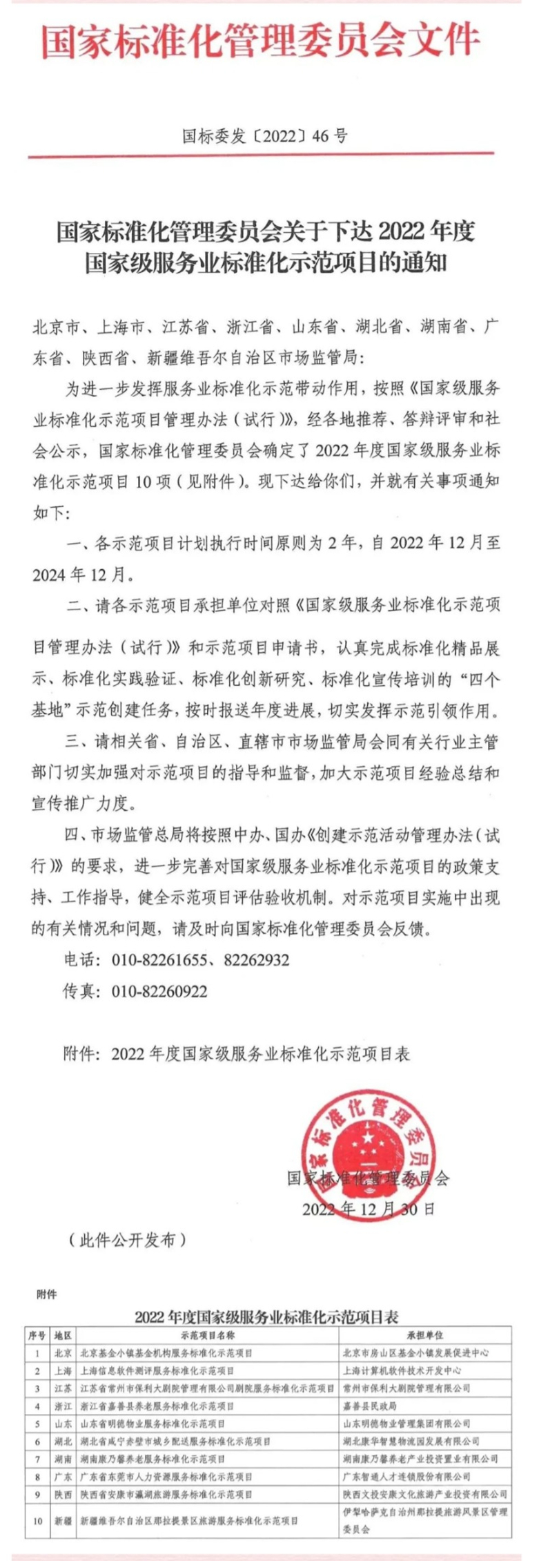2022年12月30日,國(guó)家標(biāo)準(zhǔn)化管理委員會(huì)下達(dá)全國(guó)十個(gè)國(guó)家級(jí)服務(wù)業(yè)標(biāo)準(zhǔn)化示范項(xiàng)目,“陜西省安康市瀛湖旅游標(biāo)準(zhǔn)化示范項(xiàng)目”,經(jīng)過資審、文審、選拔、答辯、公示等程序,從全國(guó)一百余家單位中脫穎而出、光榮上榜,成為陜西省第一個(gè)國(guó)家級(jí)旅游標(biāo)準(zhǔn)化示范項(xiàng)目。