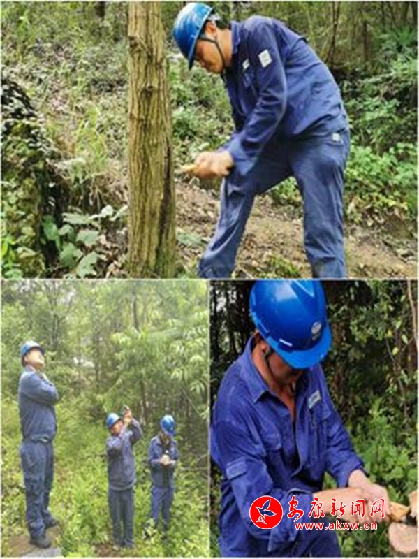 在悶熱難耐的綠樹山林間,他們頭戴藍(lán)色的安全帽,身著長(zhǎng)袖長(zhǎng)褲的工作服,不停揮舞著砍刀、電鋸,背上被浸濕的水跡,已分不清是汗水還是雨水,木屑飛舞,刀起刀落,伴隨著“轟轟轟……”的聲音,一顆顆超高樹木倒下,一條條線路通道暢通了。這不辭辛勞、團(tuán)結(jié)合作的工作場(chǎng)景幾乎每天都能在山林里看到。