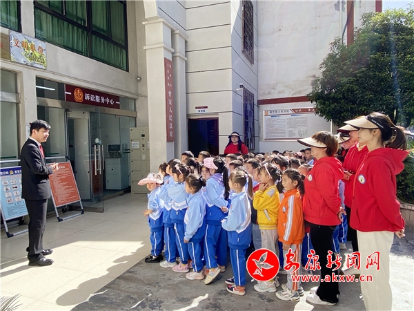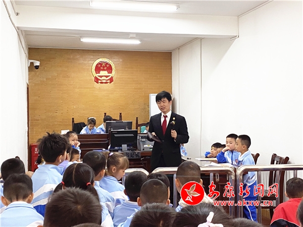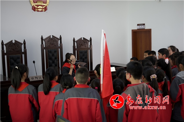 在參觀過程中,干警帶領(lǐng)同學(xué)們走進(jìn)訴訟服務(wù)中心和干警辦公室了解了法院干警的工作場(chǎng)所。隨后,帶領(lǐng)同學(xué)們參觀審判庭,現(xiàn)場(chǎng)向同學(xué)們介紹科技審判法庭的功能及庭審流程,并展示了法袍、法槌和法徽,同時(shí)用深入淺出的語(yǔ)言和提問互動(dòng)的方式向孩子們講解了法袍、法槌和法徽的象征意義,同學(xué)們興趣濃厚,紛紛走上審判臺(tái),親身感受和觸摸審判設(shè)施,感受法庭審判的嚴(yán)肅和莊重。