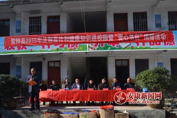 安康新聞網(wǎng)訊 (通訊員 肖寶) 在“12•4”國家憲法日暨全國法制宣傳日即將到來之際,11月26日,由紫陽團(tuán)縣委舉辦的紫陽縣2015年法制宣傳和健康知識進(jìn)校園暨“愛心書包”捐贈活動走進(jìn)斑桃小河小學(xué);顒蝇F(xiàn)場,紫陽團(tuán)縣委為全校學(xué)生購買了價值1.5萬元的愛心書包和手套,并及時發(fā)放到了每個學(xué)生的手中。