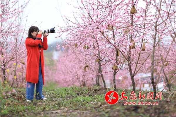游客們穿梭在桃林間賞花拍照,攝影愛好者們拿起手中的相機,以專業(yè)的攝影技巧、獨特的視角和充滿靈感的鏡頭,定格桃園的美景。