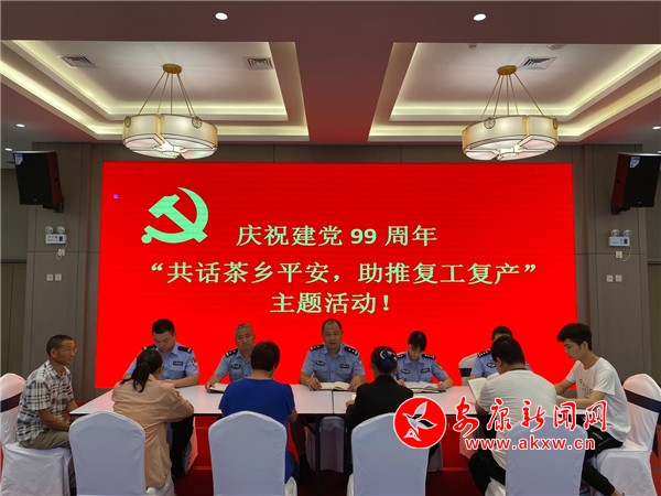 7月1日,向陽派出所黨小組邀請瓏玥茶山酒店、木魚包茶廠、銀河茶廠等企業(yè)負(fù)責(zé)人和員工,聯(lián)合舉行慶祝建黨99周年“共話茶鄉(xiāng)平安,助推復(fù)工復(fù)產(chǎn)”座談會。
