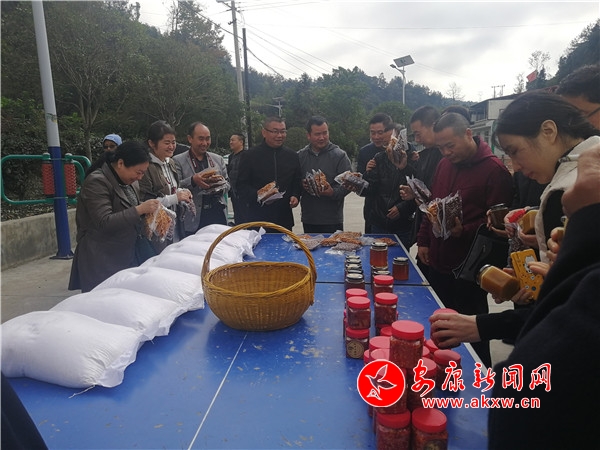 在黃金村駐村工作隊組織下,20戶貧困戶把自家生產(chǎn)加工的土特產(chǎn)品運到村中心廣場,廣場上堆放著苦蕎、土蜂蜜、土雞蛋、包谷酒、干蘿卜片、豆腐乳、黃豆醬和新鮮丹參等產(chǎn)品,幫扶干部踴躍購買,現(xiàn)場產(chǎn)品銷售一空;顒庸蹭N售了20戶貧困戶11種農(nóng)副產(chǎn)品,銷售額達1.2萬余元。