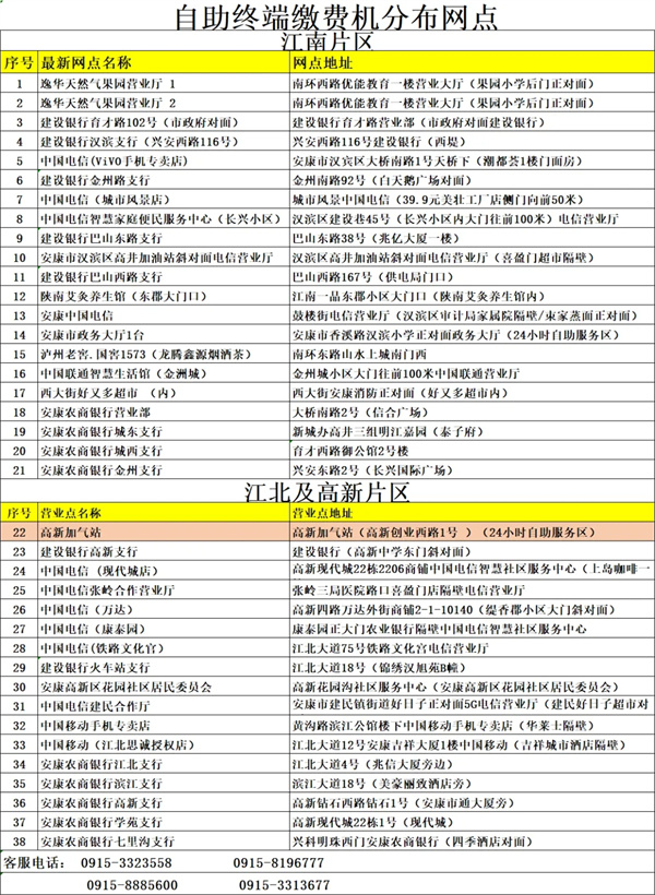 為進(jìn)一步方便廣大用戶購買天然氣,我公司在電信營業(yè)廳、建設(shè)銀行、農(nóng)商銀行及便民服務(wù)點(diǎn)等網(wǎng)點(diǎn)布設(shè)38臺天然氣自助終端繳費(fèi)機(jī),F(xiàn)溫馨提示您關(guān)注“安康市逸華天然氣有限公司”微信公眾號查看自助機(jī)分布網(wǎng)點(diǎn),選擇就近網(wǎng)點(diǎn)進(jìn)行天然氣充值。其他業(yè)務(wù)可在工作時間內(nèi)前往以下人工服務(wù)大廳或窗口辦理,部分業(yè)務(wù)也可通過微信公眾號的“微營業(yè)廳”辦理: