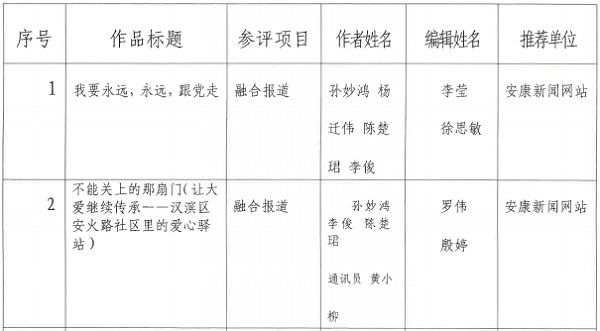 按照省記協(xié)要求,特將推薦參評(píng)2023年度陜西新聞獎(jiǎng)融合報(bào)道初評(píng)的作品予以公示。公示期為2024年1月16日至1月22日,在此期間內(nèi)如有異議請(qǐng)向新聞管理部反饋。報(bào)送作品如下: DAa安康新聞網(wǎng)
