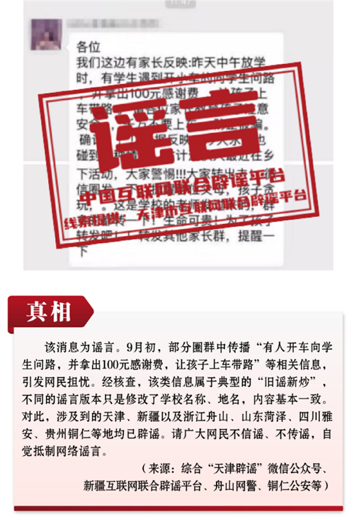 謠言2:多地發(fā)生“拿100元騙孩子上車帶路”事件?