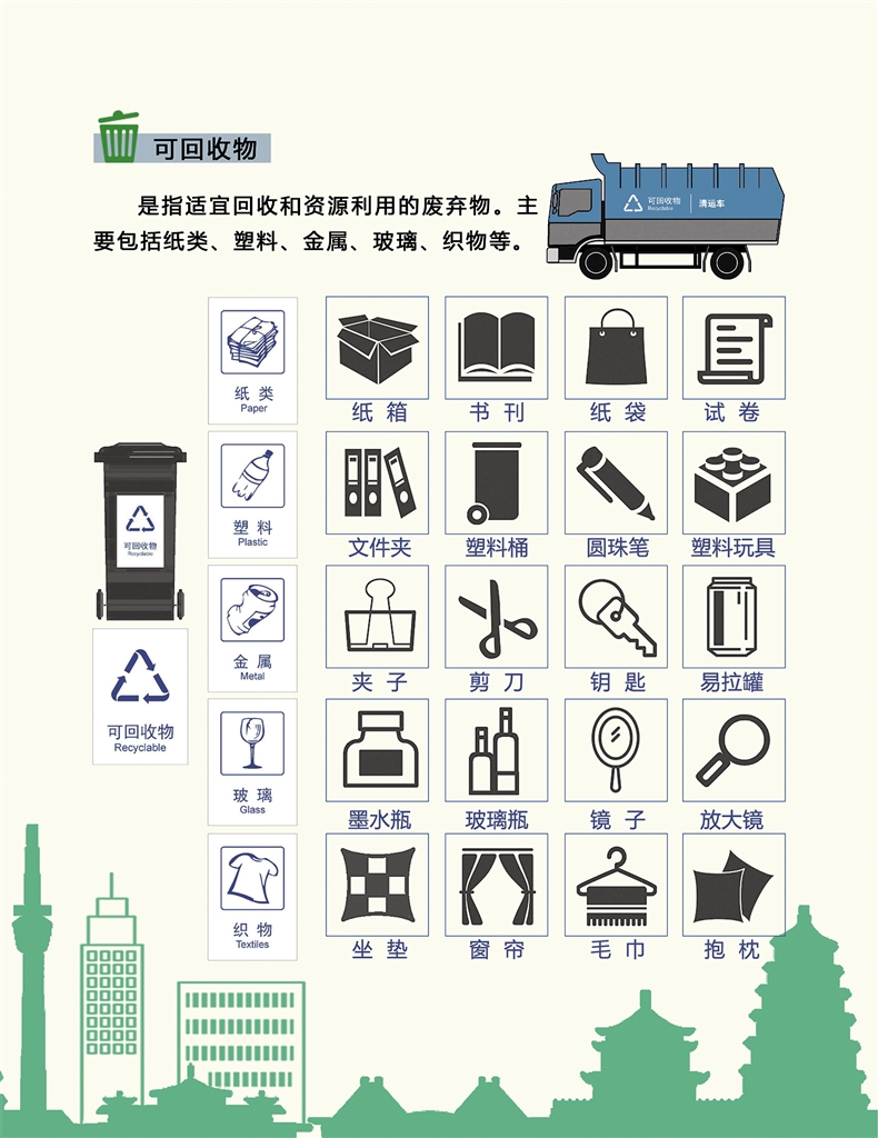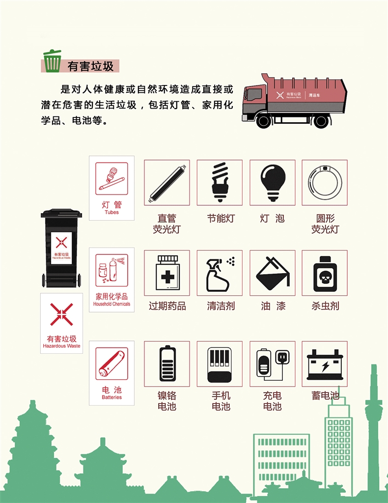 垃圾可以分為可回收垃圾、廚余垃圾、有害垃圾和其他垃圾四類?苫厥绽饕◤U紙、塑料、玻璃、金屬和布料五大類;廚余垃圾包括剩菜剩飯、骨頭、菜根菜葉、果皮等食品類廢物;有害垃圾包括廢電池、廢日光燈管、廢水銀溫度計、過期藥品等,這些垃圾需要特殊安全處理;其他垃圾包括除上述幾類垃圾之外的磚瓦陶瓷、渣土、衛(wèi)生間廢紙、紙巾等難以回收的廢棄物,采取衛(wèi)生填埋可有效減少對地下水、地表水、土壤及空氣的污染。