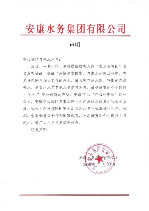 近日,一些小區(qū)、單位微信群有人以“市水業(yè)集團(tuán)”名義發(fā)布提醒,提醒“疫情非常時(shí)期,自來(lái)水處理過(guò)程中,在允許范圍內(nèi)加大氯氣的注入。請(qǐng)大家在用水時(shí),特別是在燒開(kāi)水、煮飯用水前要把水提前接出來(lái),最少靜置兩個(gè)小時(shí)以上再用。”我公司特此聲明,安康市無(wú)“市水業(yè)集團(tuán)”這一公司,安康中心城區(qū)自來(lái)水凈化生產(chǎn)及供水服務(wù)由我公司負(fù)責(zé)。我公司嚴(yán)格按照國(guó)家生活飲用水衛(wèi)生標(biāo)準(zhǔn)進(jìn)行生產(chǎn)、檢測(cè),余氯含量完全符合國(guó)家規(guī)范,不用靜置兩個(gè)小時(shí)以上再使用。請(qǐng)廣大用戶不要信謠傳謠。iNX安康新聞網(wǎng)