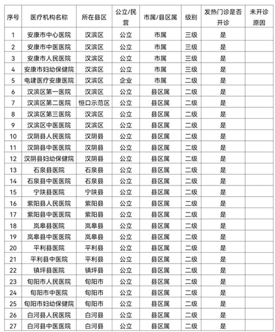 安康市二級以上醫(yī)療機構發(fā)熱門診點位