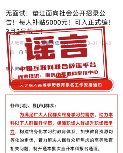 真相:近日,“墊江招聘信息網(wǎng)”微信公眾號(hào)發(fā)布信息:“無面試!重慶墊江面向社會(huì)公開招錄公告!每人補(bǔ)貼5000元!可入正式編!”部分網(wǎng)民看到該信息后誤認(rèn)為,墊江面向社會(huì)以補(bǔ)貼形式招錄具有正式編制的公務(wù)人員,于是紛紛向墊江縣有關(guān)部門致電咨詢招錄情況。經(jīng)核實(shí),近年來,墊江未曾以補(bǔ)貼方式和不經(jīng)過面試招錄具有正式編制公務(wù)人員。該信息實(shí)則為成人學(xué)歷提升培訓(xùn)信息,而非正式編制公務(wù)人員招錄信息。墊江縣互聯(lián)網(wǎng)信息辦公室已依法對(duì)發(fā)布該信息的微信公眾號(hào)負(fù)責(zé)人進(jìn)行約談和教育批評(píng),指出虛假信息的危害性,并責(zé)令刪除相關(guān)信息。(來源:重慶辟謠)