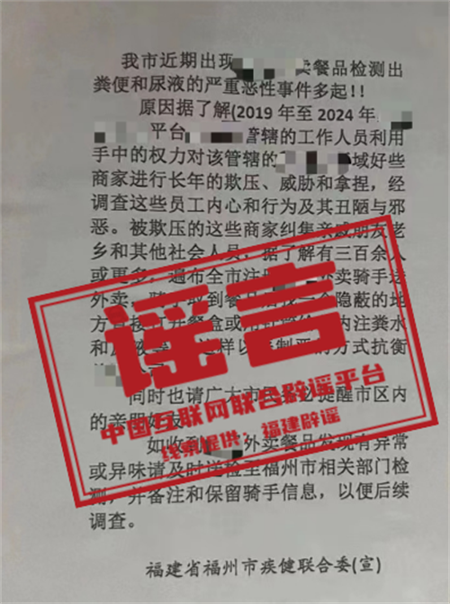 謠言:“福建省福州市疾健聯合委”發(fā)文稱“某外賣平臺餐品檢出糞便和尿液”?