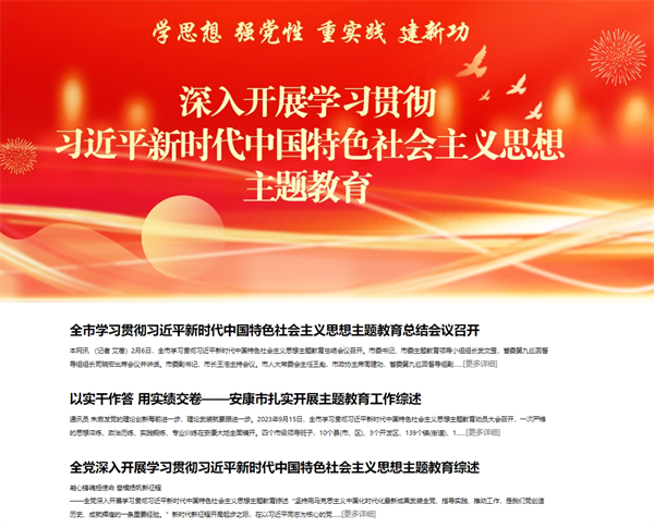 二是圍繞“深入開展學(xué)習貫徹習近平新時代中國特色社會主義思想主題教育”。安康新聞網(wǎng)認真統(tǒng)籌謀劃,深入開展學(xué)習貫徹習近平新時代中國特色社會主義思想主題教育宣傳報道工作。網(wǎng)站及時推出“深入開展學(xué)習貫徹習近平新時代中國特色社會主義思想主題教育”專欄,介紹我市、各縣(市、區(qū))及單位部門組織開展主題教育的經(jīng)驗做法。