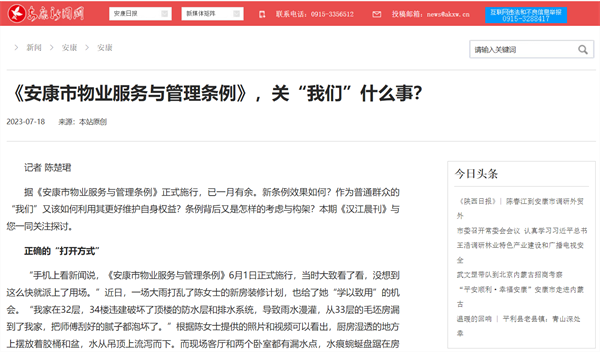 安康新聞網(wǎng)履行媒體輿論監(jiān)督職能,聚焦民生熱點,開辦《不文明行為曝光臺》輿論監(jiān)督專欄,集中曝光身邊的不文明現(xiàn)象、行為,引導(dǎo)市民群眾自覺規(guī)范文明行為,主動融入城市文明創(chuàng)建熱潮,為提升市民文明素質(zhì)和城市文明程度貢獻媒體力量。同時,聚焦群眾關(guān)切,積極開展調(diào)查性報道,發(fā)布《〈安康市物業(yè)服務(wù)與管理條例〉關(guān)“我們”什么事?》等一批原創(chuàng)新聞,還原事件真相,及時宣講與群眾生活息息相關(guān)的最新政策條例,體現(xiàn)地方黨媒的責任與擔當。