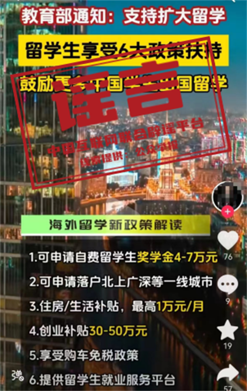 詳情:近日,有自媒體在多個(gè)網(wǎng)絡(luò)平臺(tái)發(fā)布視頻,稱“教育部留學(xué)中心召開(kāi)發(fā)布會(huì)宣布‘將擴(kuò)大支持留學(xué),留學(xué)生將享受申請(qǐng)自費(fèi)留學(xué)獎(jiǎng)學(xué)金、申請(qǐng)落戶一線城市等六大政策扶持’等留學(xué)新政策”。對(duì)此,教育部留學(xué)服務(wù)中心7月29日鄭重聲明:該視頻虛假不實(shí),我中心從未召開(kāi)此發(fā)布會(huì),從未發(fā)布過(guò)相關(guān)政策。所謂六大政策支持,主要是對(duì)部分地方有關(guān)政策的拼湊和夸大。請(qǐng)廣大留學(xué)生及公眾提高警惕,謹(jǐn)防上當(dāng)受騙。對(duì)此類(lèi)造謠炒作行為,我中心保留追究相關(guān)方法律責(zé)任的權(quán)利。(來(lái)源:“教育部留學(xué)服務(wù)中心”微信公眾號(hào))