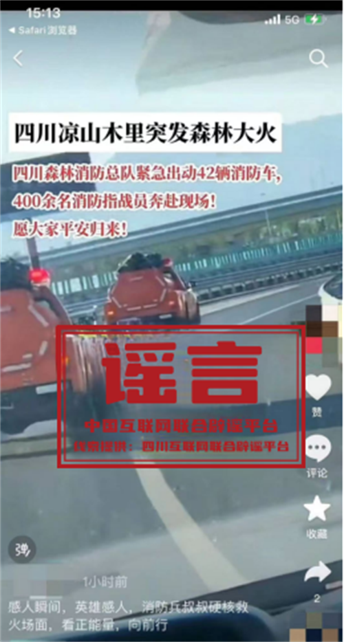 真相:近日,有網(wǎng)民在短視頻平臺(tái)上發(fā)布視頻,并配以“四川涼山木里突發(fā)森林大火,四川森林消防總隊(duì)緊急出動(dòng)42輛消防車,400余名消防指戰(zhàn)員奔赴現(xiàn)場”的文字。當(dāng)?shù)鼐W(wǎng)信部門聯(lián)動(dòng)應(yīng)急管理局進(jìn)行查核,證實(shí)四川涼山木里近日未發(fā)生森林大火。(來源:四川互聯(lián)網(wǎng)舉報(bào)辟謠平臺(tái))7pE安康新聞網(wǎng)