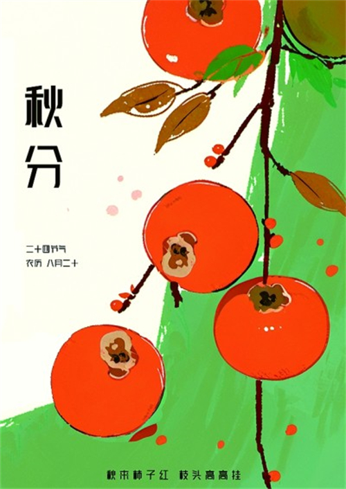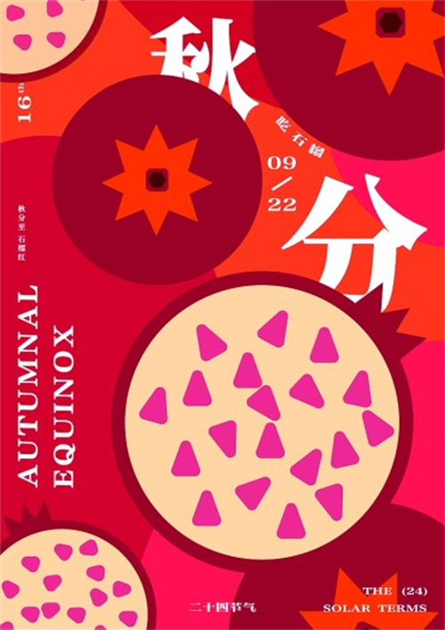 秋分到,柿子紅。柿子又稱“朱果”,立秋之后的柿子更加甜美可口。圖①作品取柿子的吉祥寓意,刻畫了一幅秋柿高掛枝頭的場(chǎng)景,成熟的柿子飽滿而有光澤,看起來(lái)非常吸引人。圖②則以“秋分吃石榴”為主題展開創(chuàng)作,將俯視的石榴與切開的石榴圖形化,通過(guò)形狀的大小對(duì)比以及色塊的明度變化,增加了海報(bào)的視覺層次感和前后縱深感,使單一元素變得豐富;在色彩選擇上,通過(guò)暗紅色與淡黃色的對(duì)比,帶來(lái)了比較跳躍的視覺體驗(yàn)。