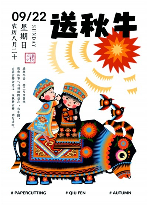 秋分是一個(gè)重要的農(nóng)業(yè)節(jié)氣,也是中國(guó)傳統(tǒng)文化中的重要時(shí)刻,民間很重視秋分節(jié)氣,有著各種秋分習(xí)俗。例如“送秋牛”,一般在紅紙或黃紙上畫農(nóng)夫耕田圖樣,再印上全年農(nóng)歷節(jié)氣情況,送圖者都是些民間善言唱者,主要說(shuō)些秋耕吉祥、不違農(nóng)時(shí)的話。圖③借用工藝美術(shù)家?guī)焓缣m的剪紙作品形式,將其基本圖形進(jìn)行組合再創(chuàng)作,配色選用橙黃為主、藍(lán)色為輔,顯得既貼近傳統(tǒng),又生動(dòng)有趣。