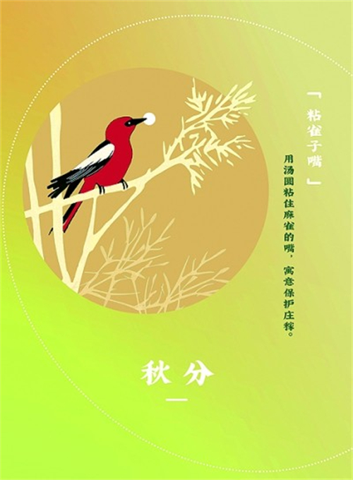 秋分的另一個(gè)有趣習(xí)俗是“粘雀子嘴”,即用一些沒(méi)有餡兒的糯米團(tuán)子,以竹簽串好插在田間地頭,喂食給鳥雀,寓意“粘住麻雀的嘴”,以保護(hù)莊稼、確保糧食收成。圖⑤作品采用橙黃和黃綠色調(diào),營(yíng)造出秋日的溫暖氛圍;海報(bào)中央的圓形圖案框是湯圓的抽象再現(xiàn),圓框內(nèi)麻雀站在枝頭,嘴中叼著軟糯的湯圓,形象地展現(xiàn)了“粘雀子嘴”的習(xí)俗。