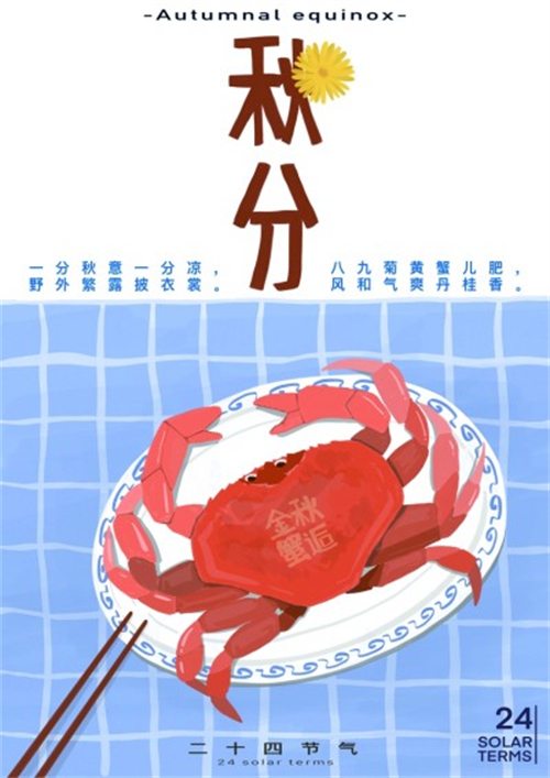 “秋風(fēng)起,蟹腳癢,菊花開,聞蟹來(lái)。”把酒持螯,真可謂一件樂(lè)事。圖⑥畫面中央的大閘蟹紅艷誘人,寓意豐收與團(tuán)圓;白色盤子與藍(lán)色格子桌布相映成趣,增添節(jié)日溫馨感;黃色的菊花與“秋分”字樣相襯,融合了中國(guó)傳統(tǒng)元素與現(xiàn)代審美,傳遞出濃厚的秋分節(jié)氣氛圍。