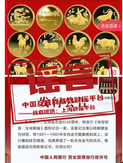真相:“為紀念十二生肖金幣發(fā)行40周年,特發(fā)行《傳世財富·生肖聚!穲A形紀念章一套”“一次性收齊央行十二生肖紀念幣”……直播間里的各種“紀念幣”,有的甚至帶有“央行發(fā)行公告”等“紅頭文件”,讓人真假難辨。經(jīng)上海網(wǎng)信部門調(diào)查發(fā)現(xiàn),上述網(wǎng)傳商品與央行發(fā)行的紀念幣有著天壤之別。很多商家故意混淆“紀念章”與“紀念幣”、“央行圖樣許可”與“央行發(fā)行”的區(qū)別,誤導(dǎo)公眾。事實上,“紀念幣”由央行發(fā)行,分為普通紀念幣與貴金屬紀念幣,“紀念章”則是商家自行設(shè)計制造的,與央行沒有關(guān)系;而“圖樣行政許可”只是表示央行同意相關(guān)單位在產(chǎn)品上使用人民幣圖樣,并不代表產(chǎn)品由央行發(fā)行。對公眾來說,想要分辨是“央行發(fā)行”還是“商家生產(chǎn)”,一是可以通過央行官網(wǎng)查看每年發(fā)行的普通紀念幣和貴金屬紀念幣項目;二是看紀念幣或紀念鈔是否有面額和貨幣單位,其中貨幣單位為“元”。(來源:“上海網(wǎng)絡(luò)辟謠”微信公眾號)