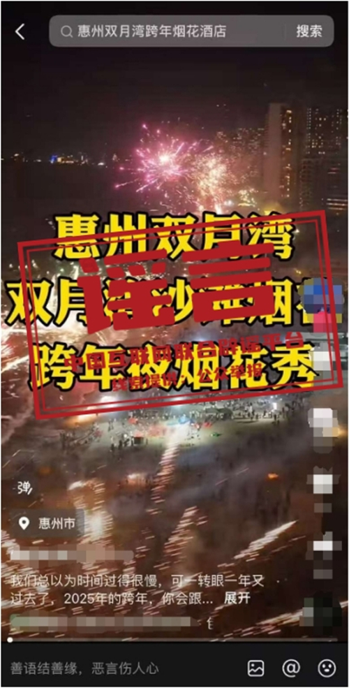 真相:近期,網(wǎng)絡(luò)上出現(xiàn) “廣東惠州雙月灣2025跨年煙花秀”“2025雙月灣跨年倒數(shù)夜”“雙月灣跨年煙花秀”等信息,引發(fā)關(guān)注。經(jīng)相關(guān)部門核實(shí),網(wǎng)傳信息均系不實(shí)信息。目前廣東省惠州市惠東縣雙月灣沒(méi)有舉辦2025年跨年煙花秀活動(dòng)的安排,請(qǐng)廣大游客不聽(tīng)謠、不信謠、不傳謠,一切以官方發(fā)布信息為準(zhǔn)。(來(lái)源:“惠州日?qǐng)?bào)”微信公眾號(hào)、惠東文旅體)