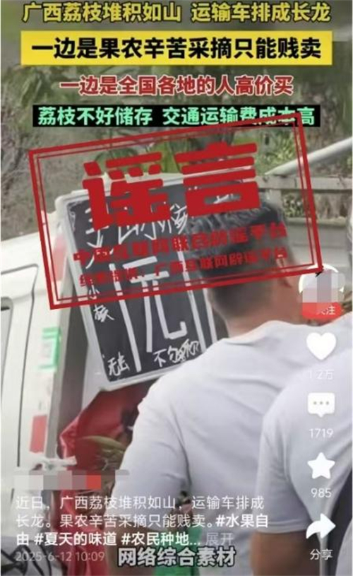 真相:6月12日,網(wǎng)傳“近日廣西荔枝堆積如山,運(yùn)輸車排成長龍。果農(nóng)辛苦采摘只能賤賣”的視頻,畫面顯示荔枝堆積和“靈山荔枝1元”字樣。經(jīng)核查,視頻內(nèi)容并非發(fā)生在靈山縣。目前,靈山荔枝“妃子笑”等中熟品種逐漸批量上市,大規(guī)模上市時間為6月20日左右,當(dāng)前荔枝產(chǎn)銷有序開展,并未發(fā)現(xiàn)個別媒體報道的“荔枝滯銷賤賣”“采摘堆積成山”“運(yùn)輸車排成長龍”的情況,也沒有發(fā)現(xiàn)價格低到1元的荔枝出售。(來源:“廣西互聯(lián)網(wǎng)違法和不良信息舉報”微信公眾號)