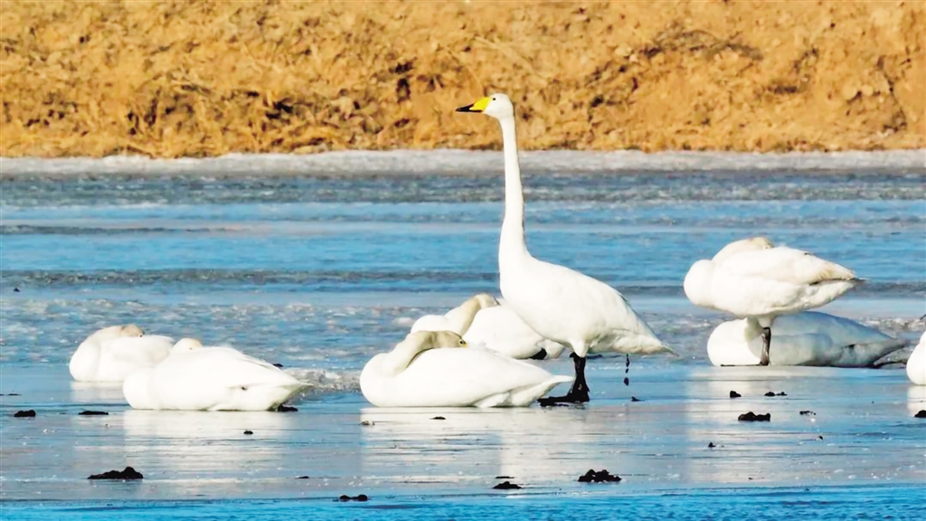 大天鵝又稱黃嘴天鵝。通體雪白色,僅頭稍沾棕黃色,虹膜暗褐色。喙黑色,上喙基部黃色,喙端黑色,喙基部粉紅色,跗跖、蹼、爪也為黑色。幼鳥(niǎo)全身灰褐色,頭和頸部較暗,下體、尾和飛羽較淡。雌雄同色,雌性體型略小,是世界上飛得最高的鳥(niǎo)類之一。(來(lái)源:安康市林學(xué)會(huì))tEd安康新聞網(wǎng)