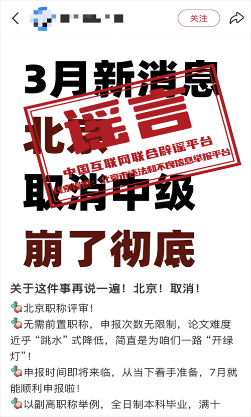 詳情:近期,2025年度職稱評審工作啟動后,網上流傳“北京取消中級職稱”的說法。經核實,此言論不實,中級職稱并未取消。據(jù)北京市人社局介紹,申報人可以對照初級、中級、高級職稱不同層級的要求,根據(jù)自身情況申請職稱評審。不同系列的職稱申報具體要求不同,以工程技術系列為例,本科畢業(yè)需要先取得中級職稱,獲評中級職稱后從事本專業(yè)技術工作滿5年,才能申報高級職稱。(來源:“北京網絡舉報”微信公眾號)