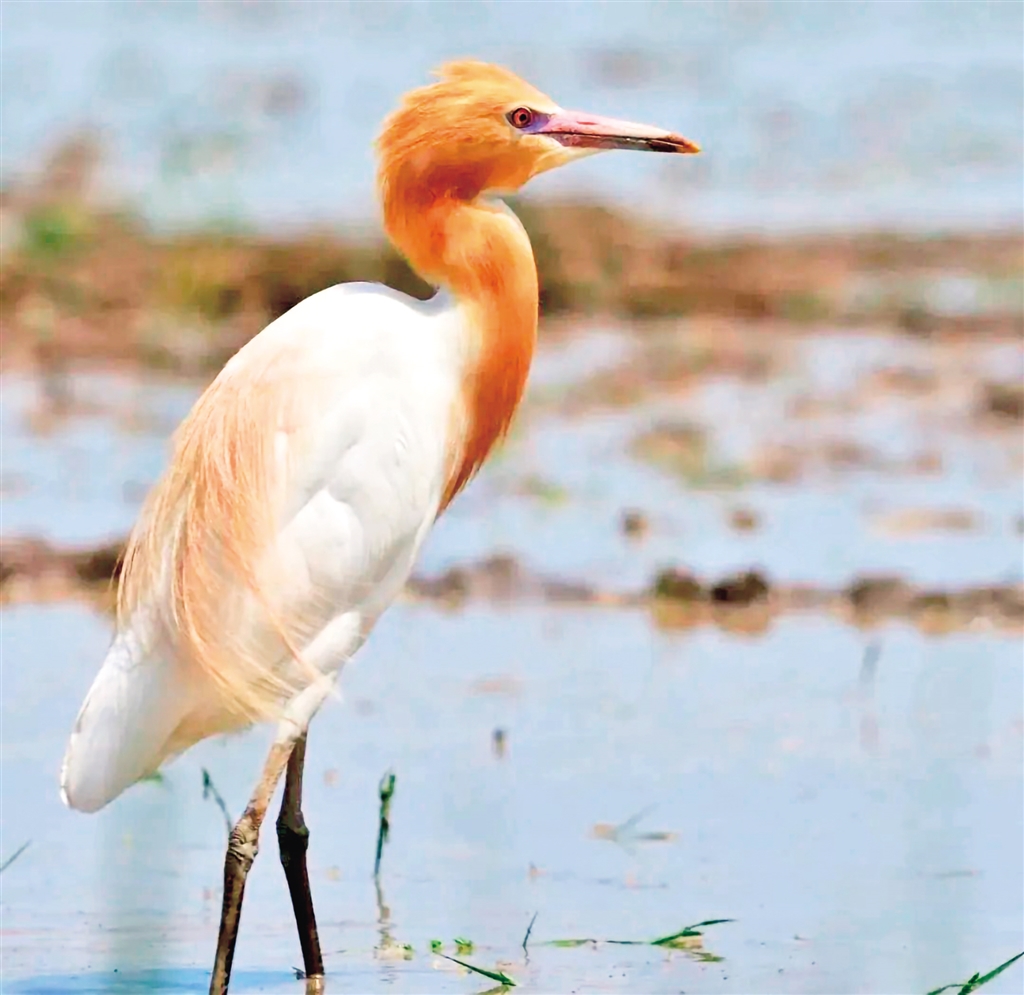 夏羽大都白色;頭和頸橙黃色,前頸基部和背中央具羽枝分散成發(fā)狀的橙黃色長形飾羽;前頸飾羽長達(dá)胸部,背部飾羽向后長達(dá)尾部,尾和其余體羽白色。冬羽通體全白色,個別頭頂綴有黃色,無發(fā)絲狀飾羽。橙黃色的喙長、尖而直,較側(cè)扁、尖端多有小鋸齒;翅較寬長,前頸的基部和背部中央具有羽枝分散成發(fā)狀的橙黃色長飾羽、前頸的飾羽長達(dá)胸部,背部的飾羽向后長達(dá)尾部。牛背鷺喜歡站在牛背上或跟隨在耕田的牛后面啄食翻出來的昆蟲和牛背上的寄生蟲等,因此得名。(來源:安康市林學(xué)會)