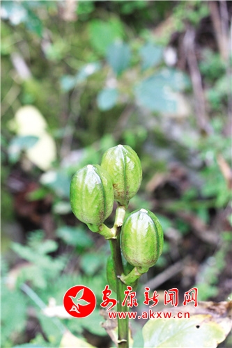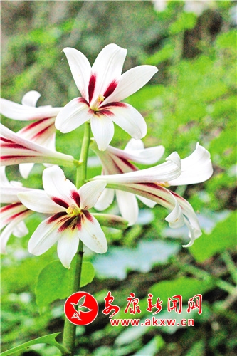 大百合生長在溪邊的山坡上,筆直的莖稈約一人高,如箭沖天,下部散有幾片寬大的綠葉,上端擎著若干喇叭狀的花兒,潔白中透著紫紅,驚艷得如同一位亭亭玉立卻羞紅了臉的美人。(圖/文 榮海) AWg安康新聞網(wǎng)