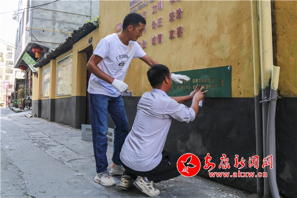 7月21日, 城區(qū)五星街社區(qū)組織人員,對五星街的背街小巷進行清理,粉刷墻面,書寫標語。(李春江)