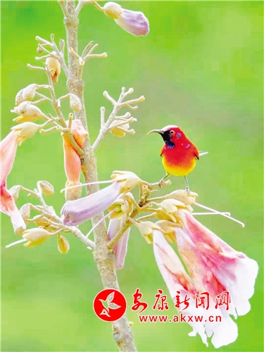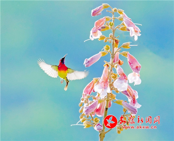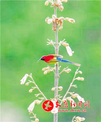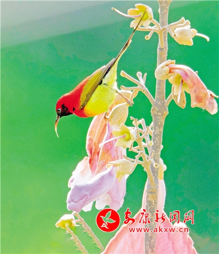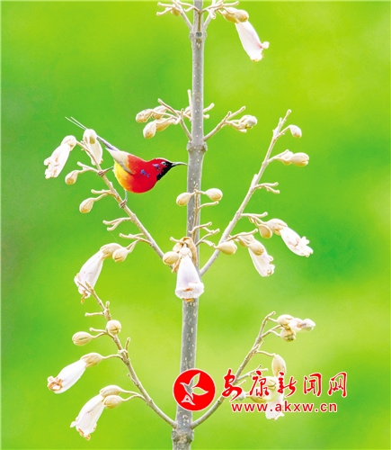 桐花鳳,是經(jīng)常出現(xiàn)在古代文人墨客筆下的吉祥鳥。但因很多人從未見過桐花鳳,遂將桐花鳳與綠毛幺鳳等混淆起來。經(jīng)今人翔實考證,才證實古“桐花鳳”就是現(xiàn)今的“太陽鳥”。太陽鳥象征著祥瑞、吉祥和諧、鳳凰齊飛、太陽重升、身化火焰而使人間恢復(fù)光明。它還是熱愛光明、追求光明、獻(xiàn)身光明的象征。太陽鳥也是太陽崇拜和鳥崇拜相結(jié)合的產(chǎn)物。太陽鳥世界共有14種,中國有6種,被譽為“東方的蜂鳥”“月下老人”,再加上太陽鳥的寓意如此之好,太陽鳥一直受到人們的喜愛與青睞。(圖文 張東風(fēng) )