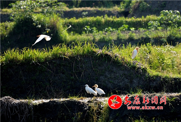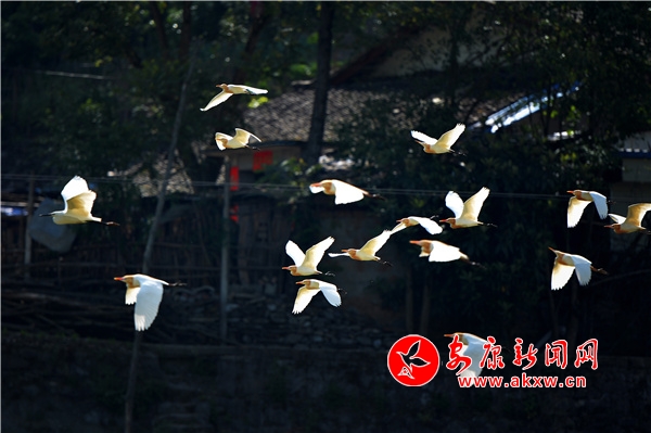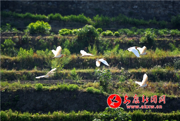 石泉城關(guān)鎮(zhèn)生態(tài)環(huán)境持續(xù)向好,在絲銀壩村草池灣翻耕過的農(nóng)田里,30余只牛背鷺時而展翅,時而降落,盡情嬉戲玩耍,撒歡覓食。(圖文/董長松)YSF安康新聞網(wǎng)
