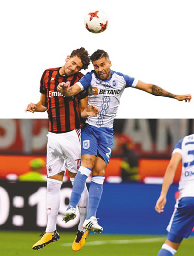 | 8月3日,在意大利米蘭進行的歐聯(lián)杯資格賽第三輪次回合比賽中,意甲AC米蘭隊主場以2∶0戰(zhàn)勝羅馬尼亞克拉約瓦大學(xué)隊。圖為兩隊球員在拼搶。 |