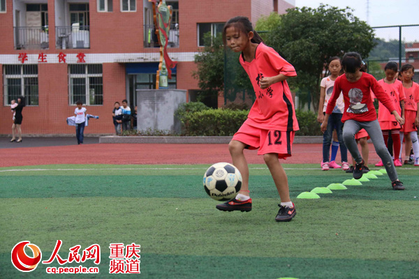 9月8日,重慶石柱縣三河鎮(zhèn)小學(xué)五年一班教室內(nèi),墻上的時鐘指向下午四點(diǎn),走廊上的下課鈴準(zhǔn)時打響,小穎(化名)拿著書包,迅速跑到球場邊的更衣室,換上球衣、球襪、球鞋?粗R子中的自己,小小的個子有著認(rèn)真的表情和堅定的眼神,她滿意的點(diǎn)點(diǎn)頭,來到了足球場上,圍繞著教練放置的足球訓(xùn)練標(biāo)志碟開始熱身。