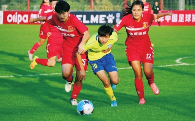 河南女足頭號(hào)射手婁佳惠(中)在比賽中 河南省球類中心供圖