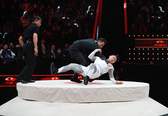 推下擂臺,背部著地,雙雙摔出場外……兩位70公斤級選手率先登場,剛?cè)岵?jì)中體現(xiàn)力量與技巧,比賽節(jié)奏緊張、勝負(fù)扣人心弦。豐富的技術(shù)動作,復(fù)雜的勁道變化,讓熟悉跆拳道、柔道和拳擊的觀眾,見識了不同于摔、打、踢的太極技擊,現(xiàn)場歡呼加油聲不斷。