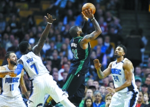 凱爾特人隊球員歐文(右二)在比賽中投籃! ⌒氯A社/美聯(lián)