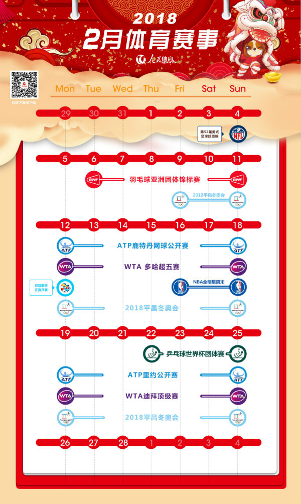 2月恰逢中國新春佳節(jié),在這辭舊迎新的月份中,體壇也大賽不斷。四年一屆的冬奧會,中國冰雪健兒是否會有新的突破,人民體育記者將親赴現(xiàn)場,為您報(bào)道;乒乓球世界杯團(tuán)體賽是乒壇開年的首個(gè)大賽。2017下半年經(jīng)歷小低谷的中國男乒急需為自己正名,面對擁有波爾、奧恰洛夫的德國隊(duì),以及進(jìn)步明顯的日本隊(duì),他們能否一一擊敗收獲8連冠,我們拭目以待。除此之外,NBA全明星周末對每個(gè)籃球迷都是大節(jié)日,看籃球巨星如何玩轉(zhuǎn)比賽;亞冠聯(lián)賽也將在本月開賽,中國球隊(duì)的表現(xiàn)令人期待。春節(jié)長假,闔家歡聚,邊看比賽邊過大年,這體驗(yàn)一定不錯(cuò),收藏我們的賽歷,精彩賽事,一覽無遺。