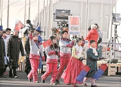 參與今天升旗儀式的中國體育代表團(tuán)約有80人,在升旗后的表演中可謂是盡顯韓國特色,從冬奧村村長到表演人員都是身著韓國民族傳統(tǒng)服裝,而且很好地將現(xiàn)代與傳統(tǒng)結(jié)合起來,尤其特別的是在結(jié)束時(shí)表演人員盡邀參與升旗儀式的中國體育代表團(tuán)集體互動(dòng),從而使得現(xiàn)場變成一場載歌載舞的歡樂“趴”。