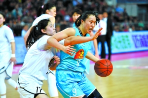 北京首鋼隊球員邵婷(右)在比賽中進攻。 新華社記者 詹彥攝