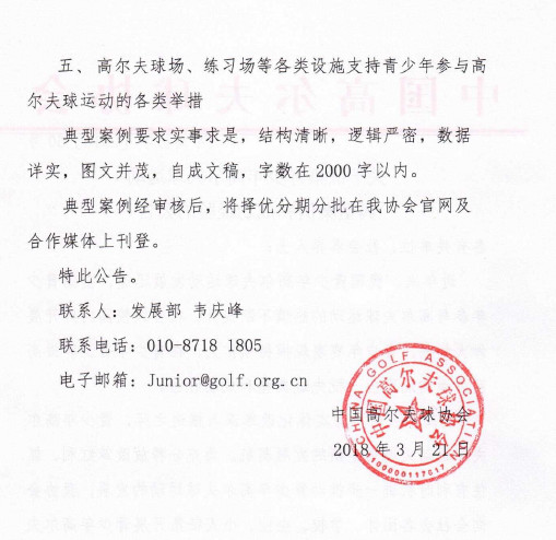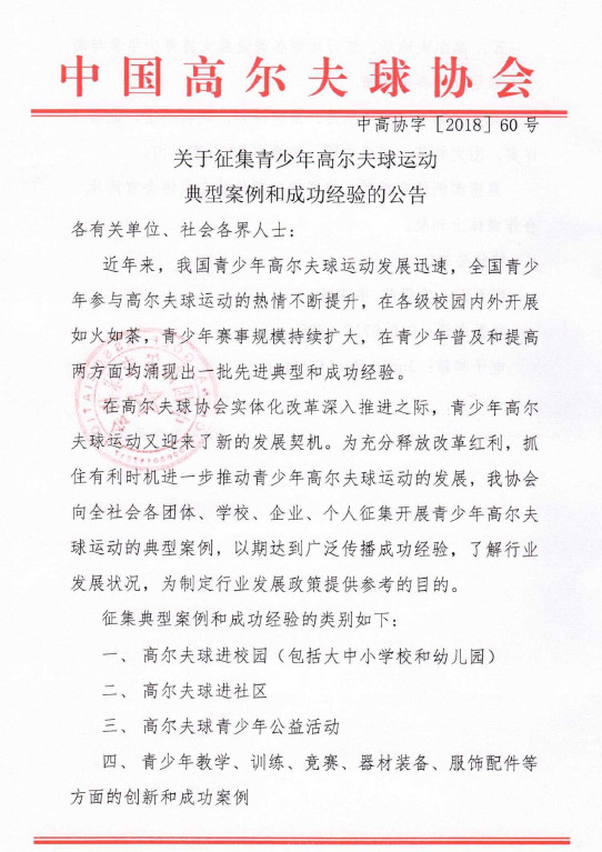 人民網(wǎng)北京3月22日電(楊喬棟)昨天,中國(guó)高爾夫球協(xié)會(huì)發(fā)布《關(guān)于征集青少年高爾夫球運(yùn)動(dòng)典型案例和成功經(jīng)驗(yàn)的公告》(簡(jiǎn)稱“公告”)。公告指出,在高爾夫球協(xié)會(huì)實(shí)體化改革深入推進(jìn)之際,青少年高爾夫球運(yùn)動(dòng)又迎來(lái)了新的發(fā)展契機(jī)。為充分釋放改革紅利,抓住有利時(shí)機(jī)進(jìn)一步推動(dòng)青少年高爾夫球運(yùn)動(dòng)的發(fā)展,我協(xié)會(huì)向全社會(huì)各團(tuán)體、學(xué)校、企業(yè)、個(gè)人征集開(kāi)展青少年高爾夫球運(yùn)動(dòng)的典型案例,以期達(dá)到廣泛傳播成功經(jīng)驗(yàn),了解行業(yè)發(fā)展?fàn)顩r,為制定行業(yè)發(fā)展政策提供參考的目的。