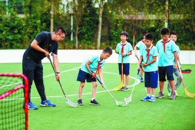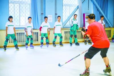 ▲中關(guān)村二小的學(xué)生在上旱地冰球課。