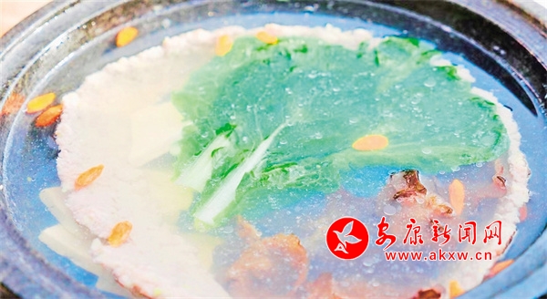 “白火石汆湯是我跟我祖父和父親學(xué)的手藝,13歲開(kāi)始學(xué)做廚,白火石汆湯里面主要用到新鮮的豬肉,加蔥姜、蛋清、鹽、雞精以及料酒、生粉、蛋清,將其剁成肉泥,貼到陶盆里面,上厚下薄,里面陸續(xù)放上木耳、小青菜、豆腐,然后把石頭燒紅之后放進(jìn)陶盆內(nèi)的紗布中,只消幾分鐘,一道美味可口的白火石汆湯便做好了。”解遠(yuǎn)平一邊準(zhǔn)備食材,一邊向筆者介紹著白火石汆湯的做法。