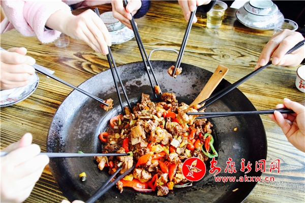 許苗苗是“好友之家”的三個(gè)合伙人之一,是個(gè)快人快語的女老板,她麻利地穿上白色大廚褂子,拿著一個(gè)從貴州定制的鐵鍋在手中掂了掂,迅速放在桌子上放油加熱,將預(yù)先準(zhǔn)備好的紅綠尖椒倒入鍋中翻炒,隨后將腌制好的雞塊伴著酒倒入鍋中,霎時(shí)間火苗竄出半米高,圍觀的客人們發(fā)出陣陣感嘆。等上幾秒火小了,許老板不慌不忙地用鏟子翻炒大致兩分鐘,香味撲鼻的鐵鍋雞便做好了。許苗苗介紹道:“貴州鐵鍋雞一雞三吃,將一只整雞剔骨,骨頭用來熬粥,帶少許骨頭的雞肉入鐵鍋進(jìn)行第一道加工食用,吃到一半的時(shí)候放入無骨雞肉上鍋燜煮十來分鐘,這樣才能將雞肉帶來的所有味覺體驗(yàn)發(fā)揮到淋漓盡致。”