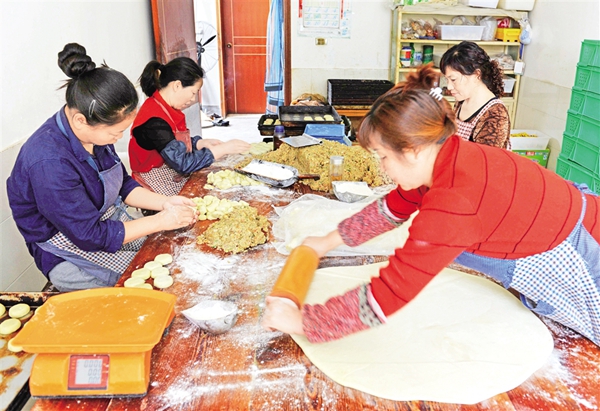 制皮、制餡、制酥、包酥、成型、蓋章、扎眼……四個(gè)人在操作時(shí)不言不語,只顧埋頭做活!