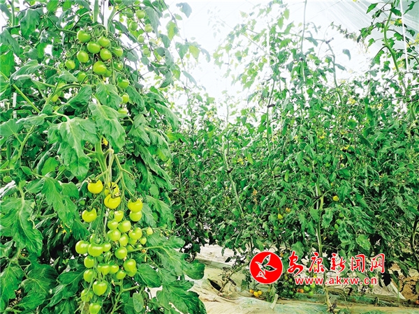 大片綠油油的菜園里,竹條支起的架子上爬滿了藤蔓,隱約可見藤蔓下藏著點(diǎn)點(diǎn)鮮紅,春日的艷陽里,點(diǎn)點(diǎn)紅色在綠葉的掩映下,顯得格外動(dòng)人,大石嶺的圣女果紅了。