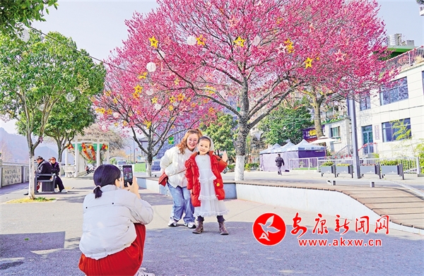 石泉縣濱江大道上紅梅競相綻放,廣大游客駐足觀看,打卡留念。譚文昌 攝