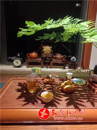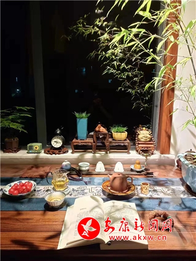 次日,我便聯(lián)系他,欲欣賞一下他的書房陳設(shè),他欣然允之,發(fā)了書房的照片。但見潔凈的白色窗臺上擺放著清秀的文竹、蔥綠的石菖蒲、一尊笑容可掬的彌勒佛、精巧小豬擺件上系著一串佛珠,雞翅木書桌上擺放著古樸典雅的茶具旁擺置一株紫竹。彼時,許是他正品著香茗,展卷而讀,然后進(jìn)入一個縱橫千萬里,上下幾千年的世界。徐徐夏風(fēng),紫竹搖曳,竹影映射于書,似也愜意。