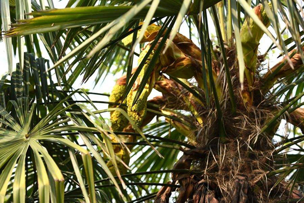 到了80年代初,當?shù)貢r興起棕床,睡起來柔軟又有彈性,舒適又隔潮氣,家道殷實人家相繼都拆掉了稻谷草鋪就的架子床換成美觀新潮的棕床,后來我才知道,做一張床,除了木料和繩子,還得十幾塊工匠錢,記得父親在陡坡上搬樹摔了一跤腰部受損,天氣一變就不停地呻吟,姐姐便使喚我們割遍自留山的棕,勉強織了一張床,是夜,父親睡得很安穩(wěn)。棕樹開的花也很有特點,花形呈佛手狀,花籽如粟米子樣金黃亮色,味道有點淡淡的苦,婆在世時常說棕樹花燉豬心,娃娃吃了補心肺,長記性,我上學(xué)時再生僻的詩文,看過一遍就爛熟于心,或許與吃過此湯不無關(guān)系,我在想,棕花入藥對治愈新冠肺炎應(yīng)該療效不錯,它也是一副神奇的中藥方劑。
